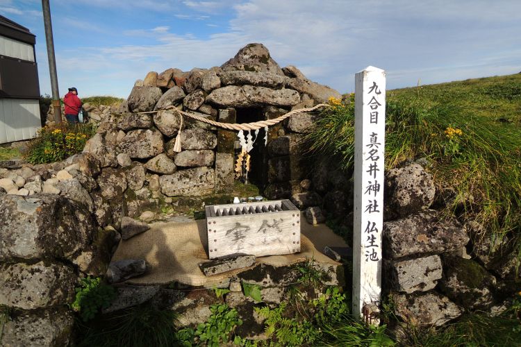 仏生池の前にある真名井神社。信仰の山だけあって、石仏や地蔵様がいくつも安置されていた。
