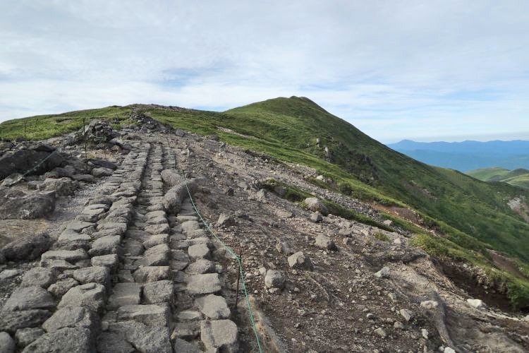 木道が終わり、よく整備された石畳の道を進む。前方の三角は1,909mピーク。
