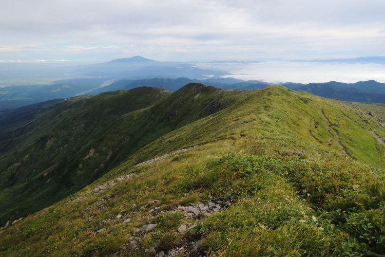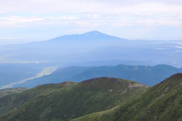 北方面には、大峰、オモワシ山、二ノ岳、一ノ岳と歩いてきた稜線が一望できる。その先には鳥海山。