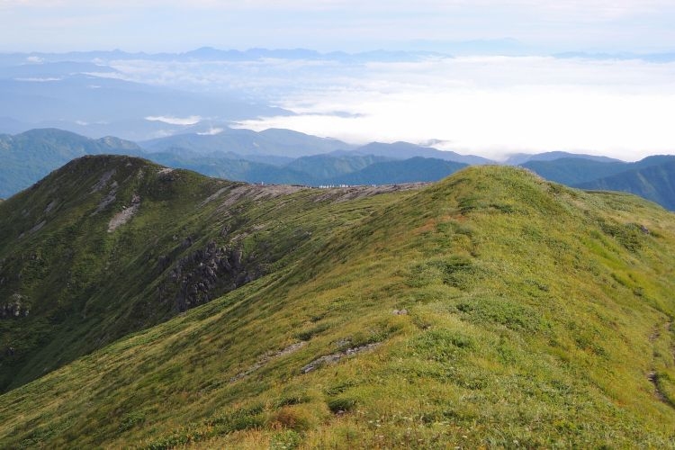 左から大朝日岳、中岳、西朝日岳、真ん中あたりに寒江山(かんこうざん)、北寒江山、相模山、右に以東岳。西朝日岳の上には飯豊連峰もうっすらと見えていた。昨日の雲海とは一転して、この日はずらりと並ぶ東北の名峰を一望できた。