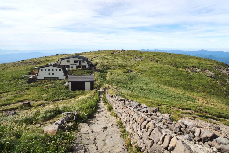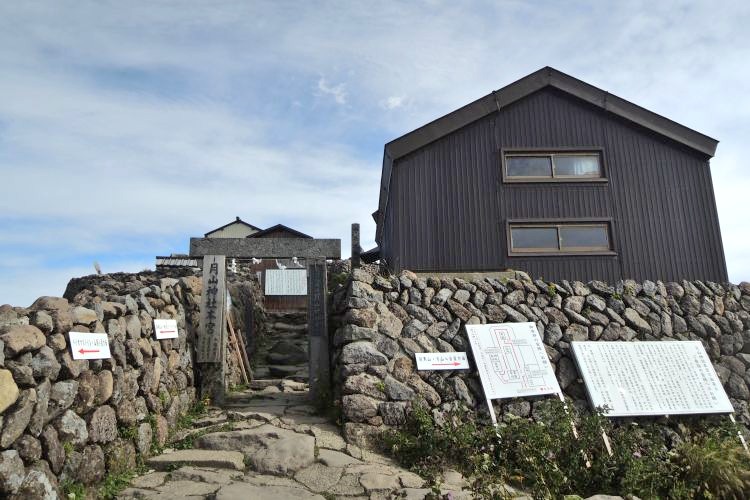 大峰から広々とした稜線を木道の終わりまで歩くと、山頂の月山神社が見えてくる。