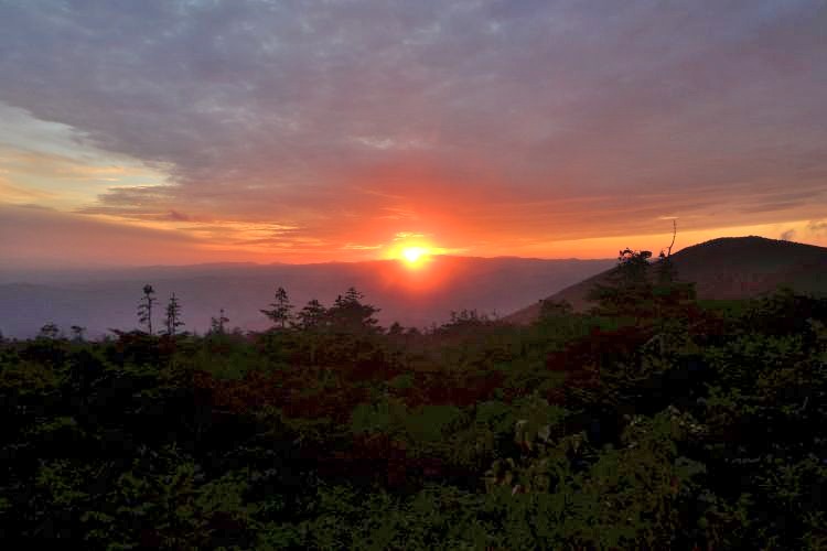 18:30 蔵王高原刈田駐車場の手前で、綺麗な日の入りを見ることができた。車の往来が皆無だったので、道路上に車を停めて写真を撮った。その夜は刈田駐車場で車中泊。広い駐車場に我が家の車だけだったので、若干心細かった。
