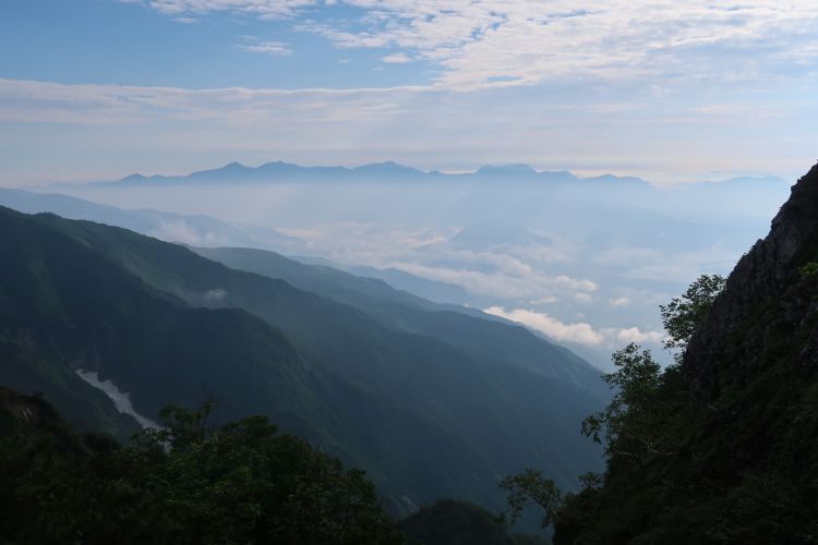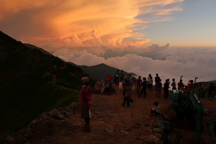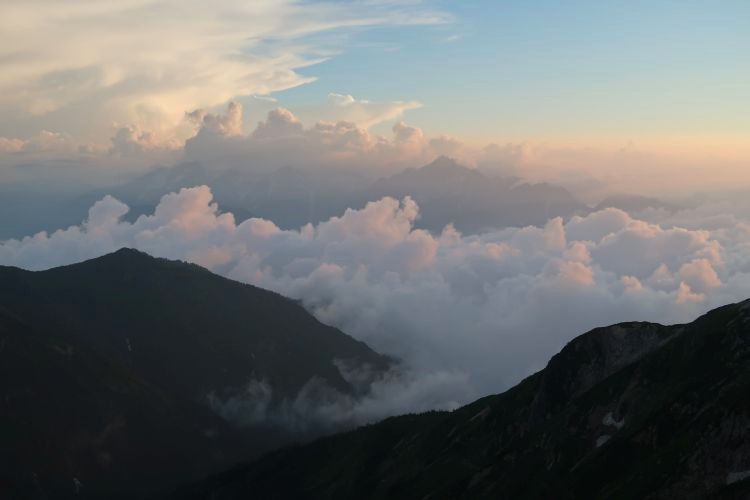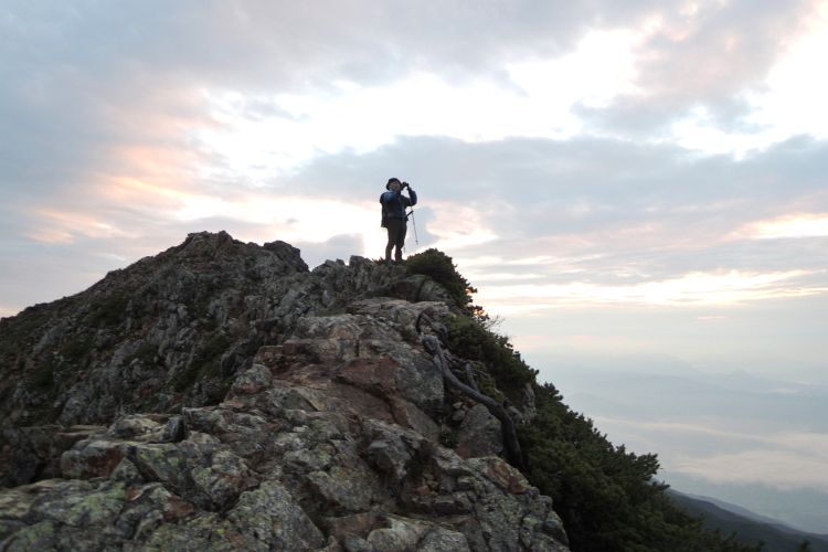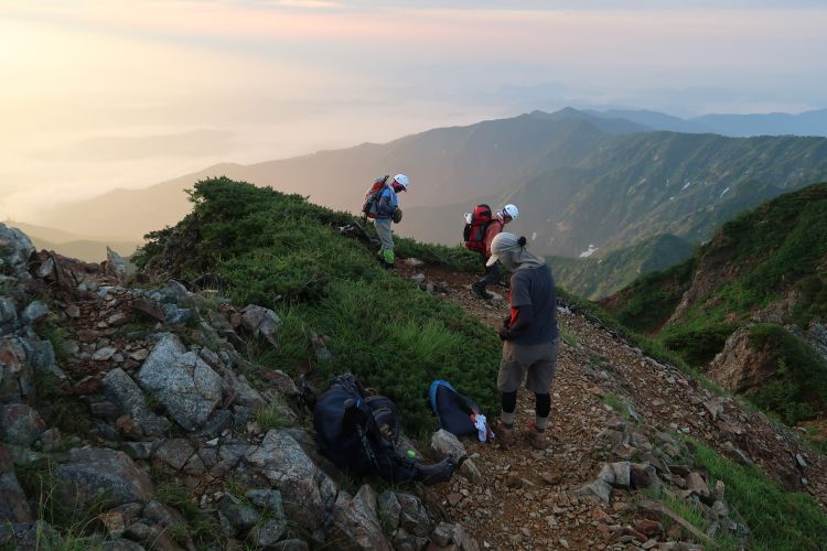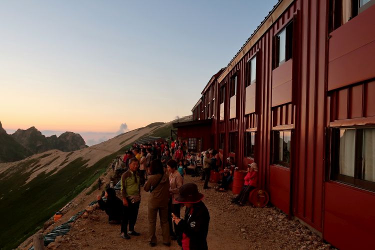 早朝から山荘は出発の準備をする登山者で賑わっており、山荘の裏から日の出を見ることができた。雲間にのぞいた太陽はすぐ隠れてしまったが、吉兆と感じた。