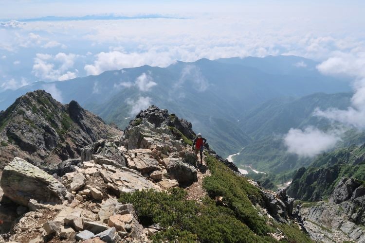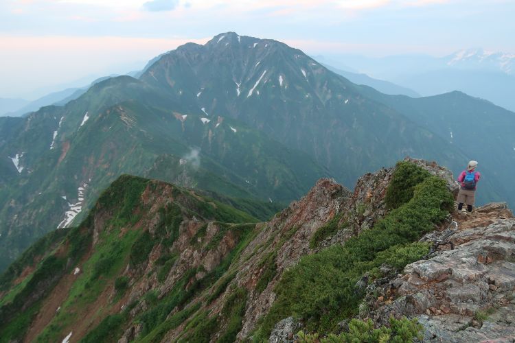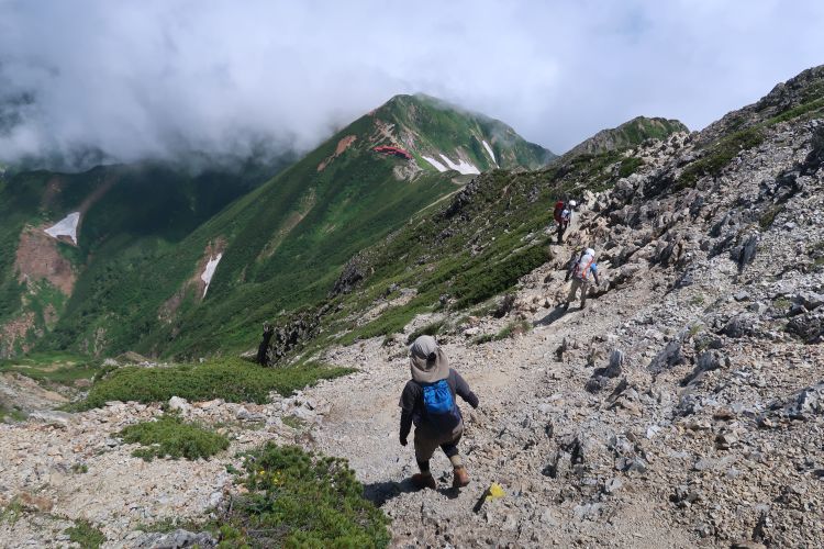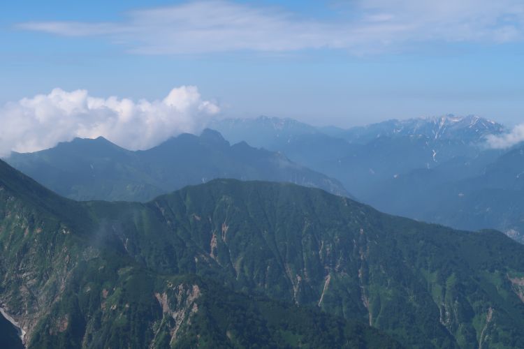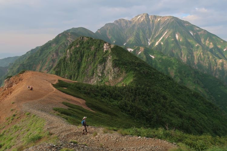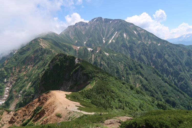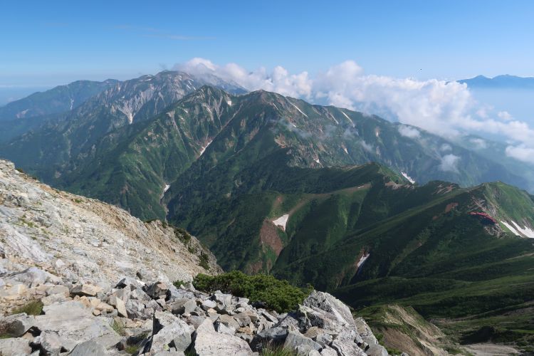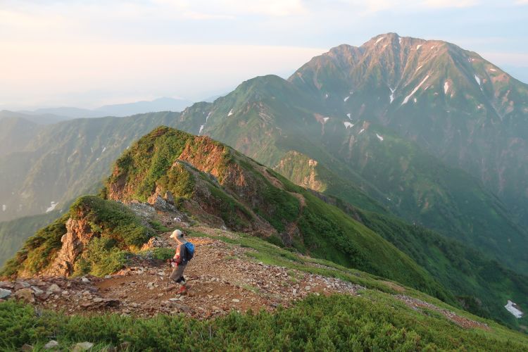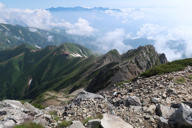 ルートの右手、西側の深い谷は餓鬼谷で、五竜岳の古称である「餓鬼ヶ岳」に由来する。餓鬼谷の向こうには立山や剣岳などの立山連峰がよく見えていた。