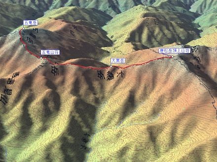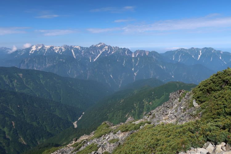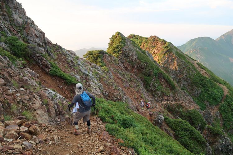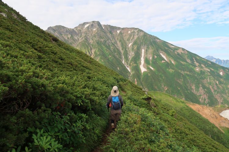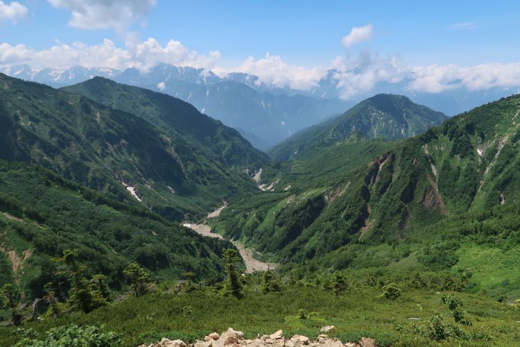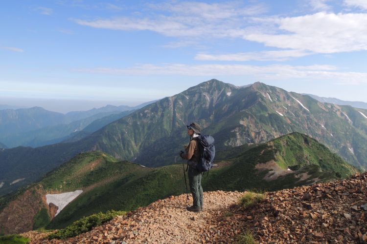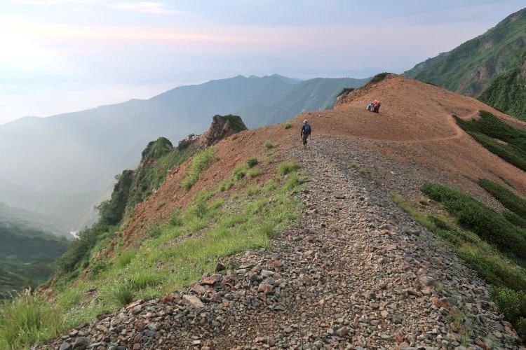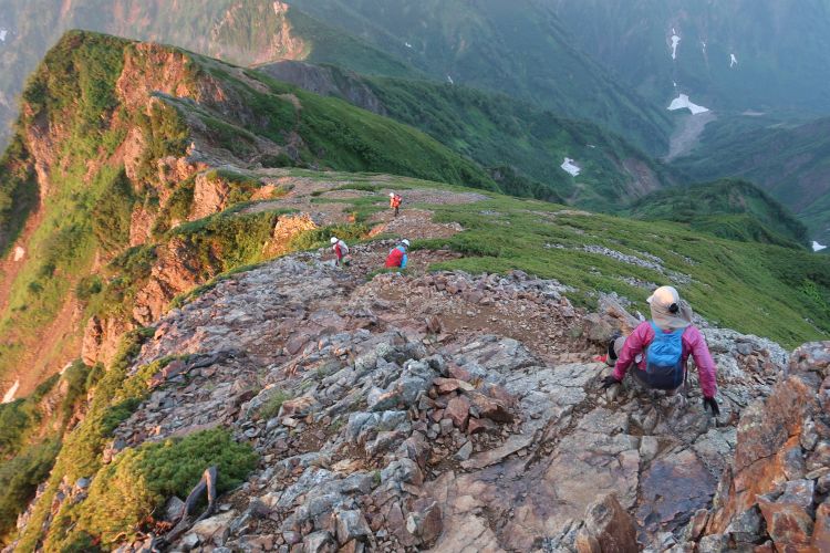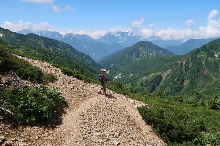 ルートの右手、西側の深い谷は餓鬼谷で、五竜岳の古称である「餓鬼ヶ岳」に由来する。餓鬼谷の向こうには立山や剣岳などの立山連峰がよく見えていた。