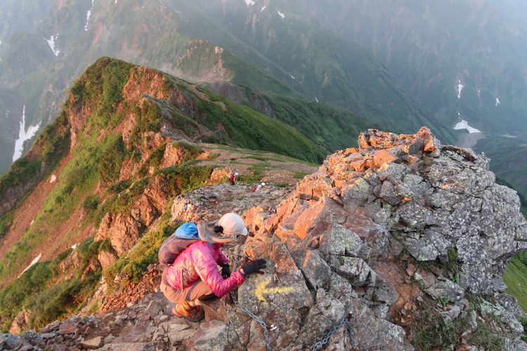 4時起床、4時50分テント場を出発。山荘横でちょうど日の出を見てからのスタートとなった。いきなり険しいクサリ場が続いて少々面喰ったが、しだいに調子が出た。大黒岳との鞍部までかなり下るので、このコースをピストンするのはキツイと思いながら歩いた。山頂に着く頃にはガスが少し出始めていたが、素晴らしい展望を楽しめた。山頂で2時間近くのんびり過ごしたが、まさに至福の時間であった。前日の疲労もあったので、ゆっくり復路を歩いたが、それでも唐松岳のテント場に早く着き過ぎて、また西日の暑さに難儀することとなった。ちなみにこの日の唐松岳は大混雑。テン場は下まで一杯で幕営できない人が出ており、山荘泊まりの登山客も多すぎて食事の準備ができる人数を超えてしまい、素泊まりしかできない人もいたようだ。