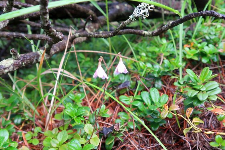 ハイマツの下に咲いていたスイカズラ科のリンネソウ。輪廻ではなく植物学者リンネが名前の由来。