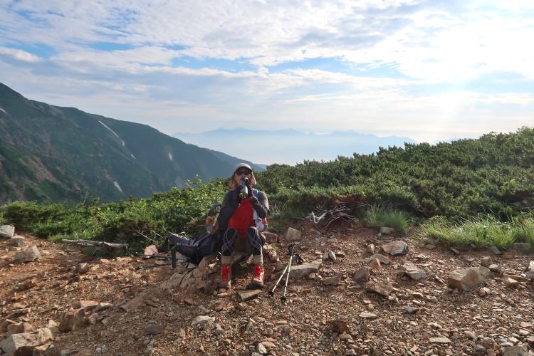 開けた稜線で一休み。嫁はお腹の調子が悪くて、下痢ストッパーを飲んでいた。