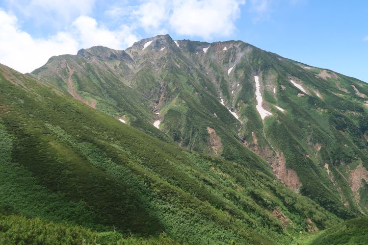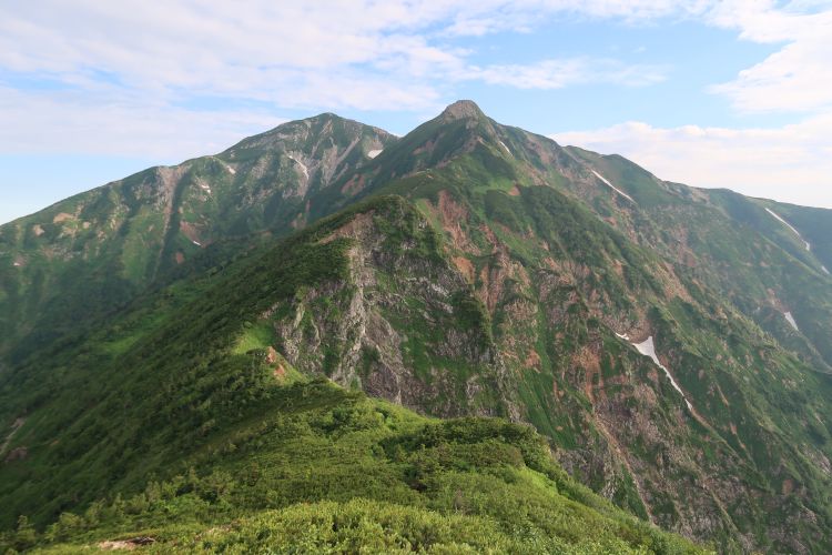 背後は猫又山、毛勝山(けかちやま)、僧ヶ岳など、立山連峰の北に連なる山々。