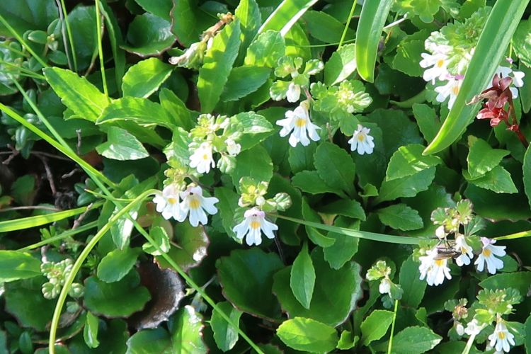 ゴマノハグサ科のミヤマコゴメグサ。本種は北アルプスに、よく似たコバノコゴメグサは南アルプスと八ヶ岳に分布している。