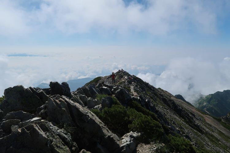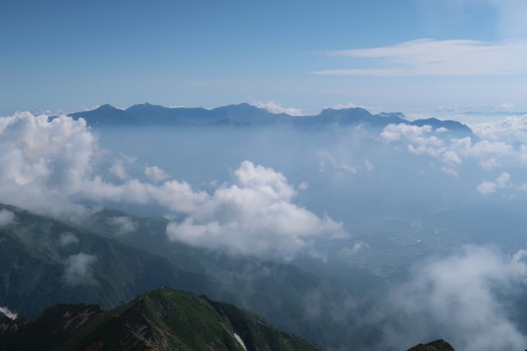 北東側の眼下には五竜山荘からの稜線が見える。その上には妙高連山が雲海に浮かんでいた。