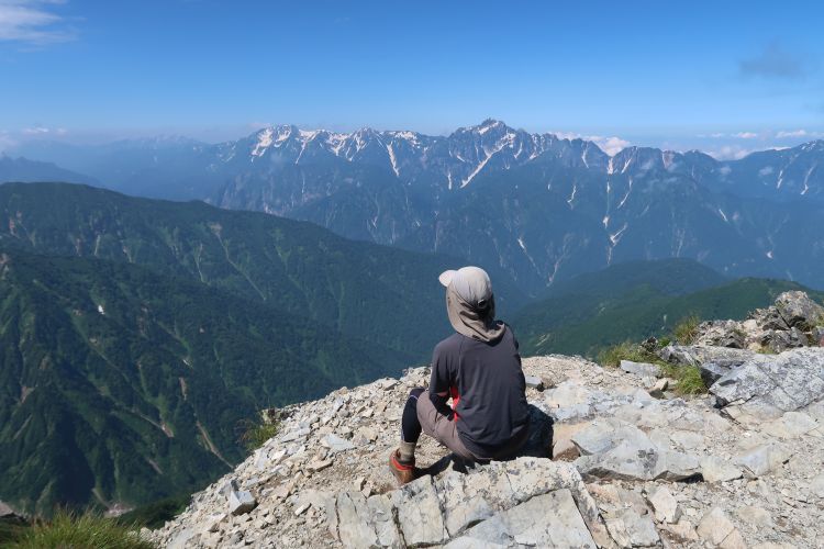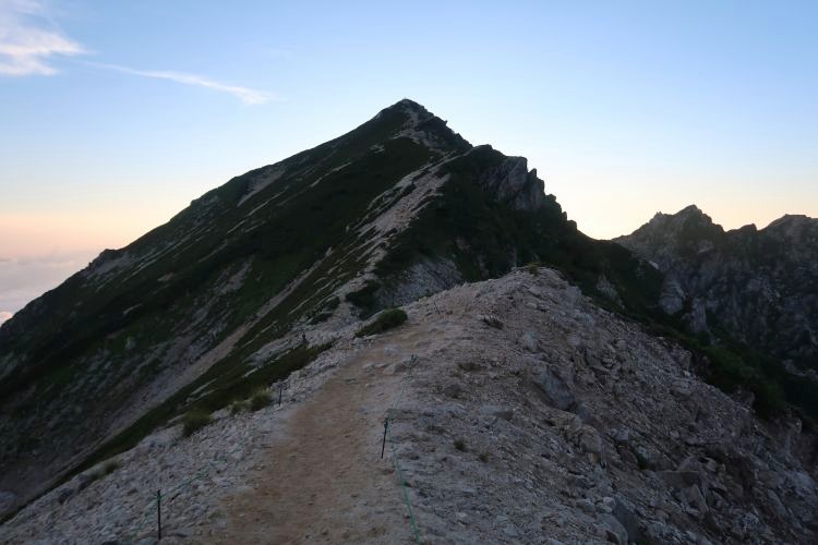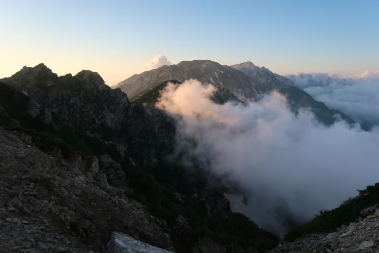 南側には鹿島槍ヶ岳の双耳峰がそびえていた。その手前は八峰キレットと呼ばれる険しい稜線。途中ですれ違った方は、奥穂高と槍ヶ岳も見えたと話していたが、鹿島槍ヶ岳の右奥に見えるはずの穂槍は、この時間はすでに雲の中だった。