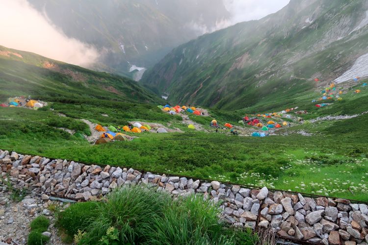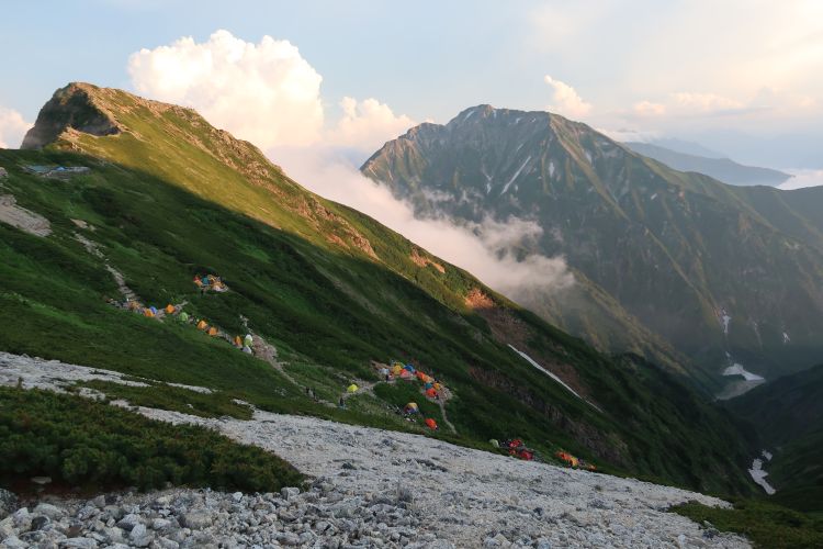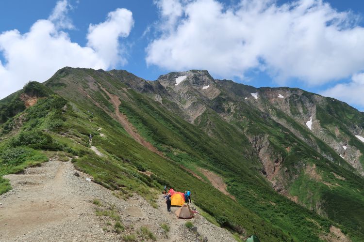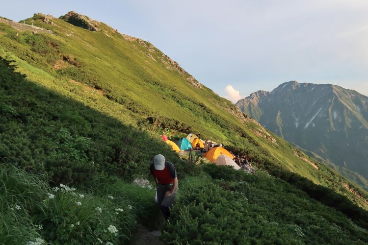 我々のテント場も登山者が協力して限界ぎりぎりまで幕営できるようにしていた。山慣れした人が多かったおかげで、夜は思いのほか静かだった。深夜に星空を眺めるつもりだったが、テントの周囲がぎゅうぎゅう詰めだし、やたらに眠たいしで、今回はそのまま朝まで寝てしまった。心配していた夜中の雨もこの日は降らなかった。