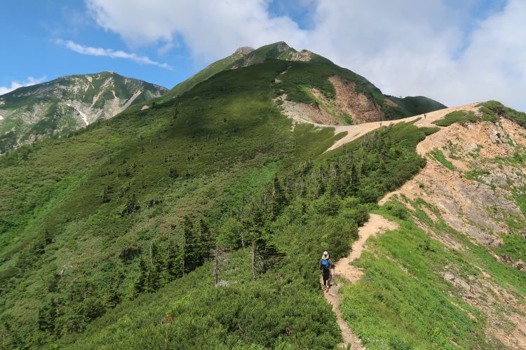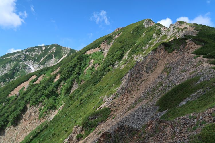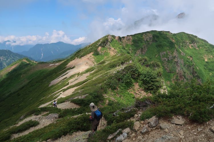 ルートの先まで見える稜線に出た。右のピークが五竜山荘の手前にある白岳(2,541m)だと後でわかった。