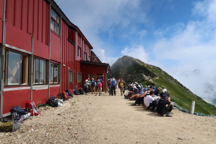 山荘の前は登山者でびっしり。宿泊の手続きをする登山者の行列ができていた。