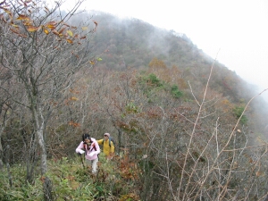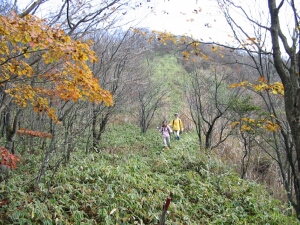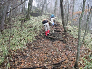 山頂からは急な下りで、それから上り返し。濡れた笹をかきわけながら進む。