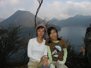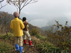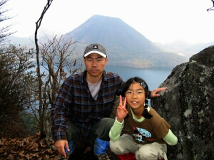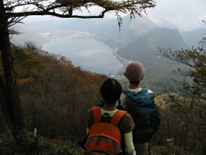 途中まで嫁も登ってきた。紅葉した西峰の向こうには榛名湖も見えていた。