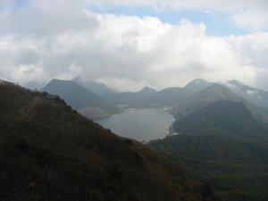 掃部ヶ岳山頂から少し下ると榛名湖の全貌が見える場所がある。