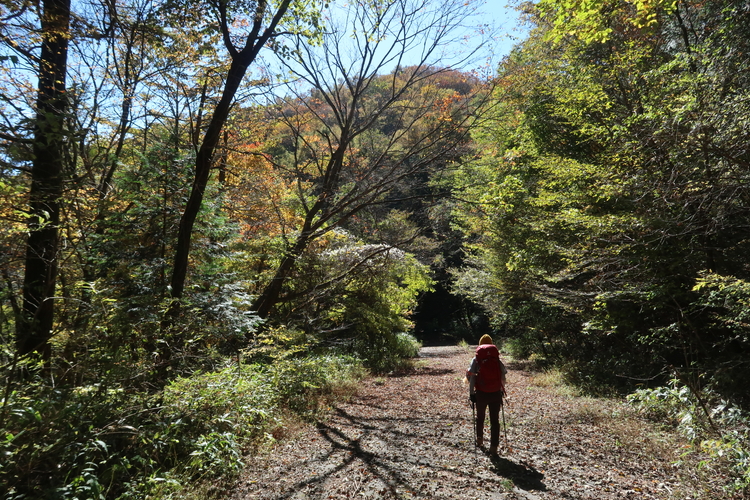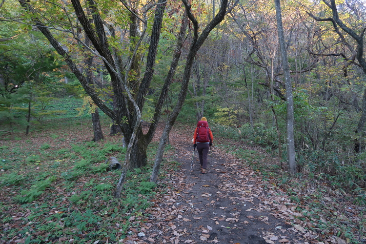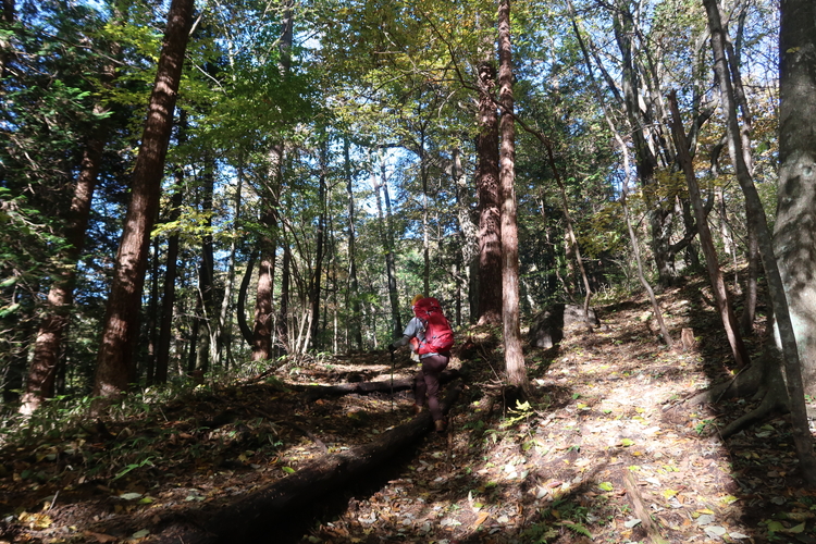 ほとんど眺めのない樹林帯の道が続く。途中で熱くなり、フリースを脱いだ。