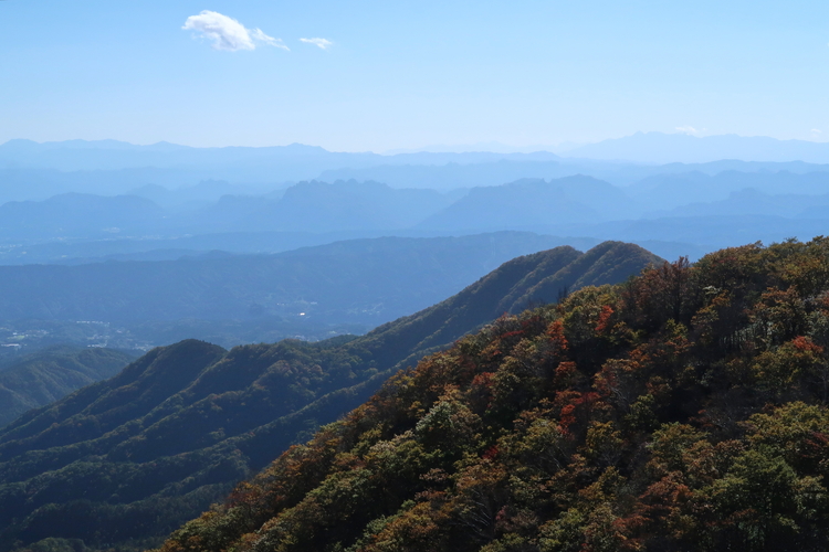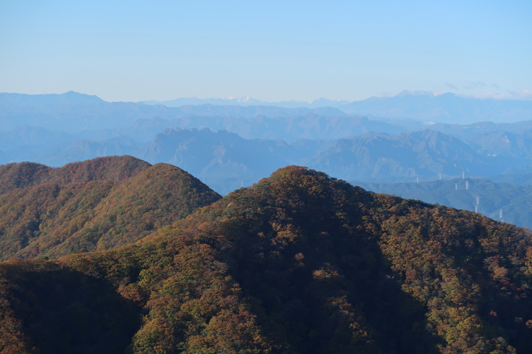 天目山の上には妙義山や荒船山が重なり、一番奥には北岳や甲斐駒ヶ岳など南アルプスも見えた。その右には赤岳など八ヶ岳も見える。