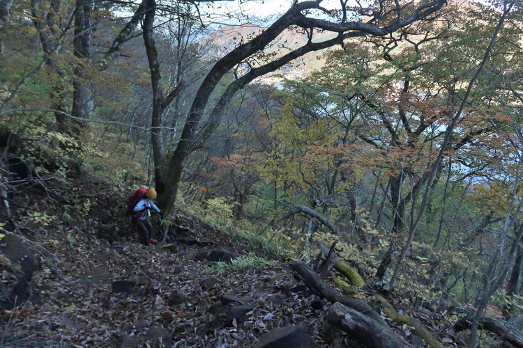 後からきて追い抜いて行った若者は、尾根から外れてルートを見失ったようだった。後から進んでいた我々は途中でおかしいと思い、尾根まで上がることにした。