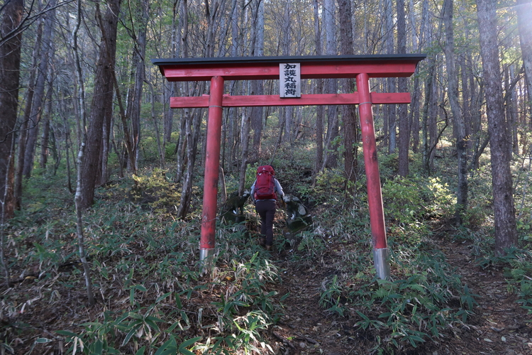 100mほど進むと登山口の道標があり、「加護丸稲荷大明神」の赤い鳥居をくぐって入山。