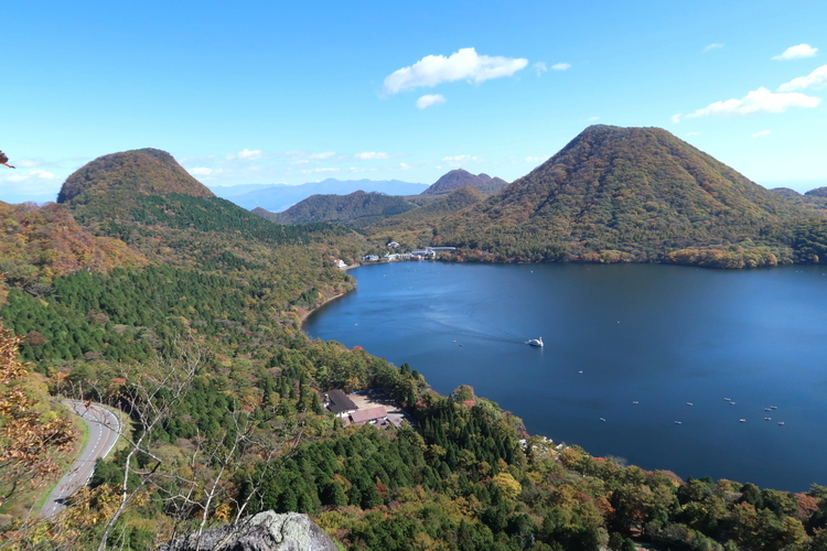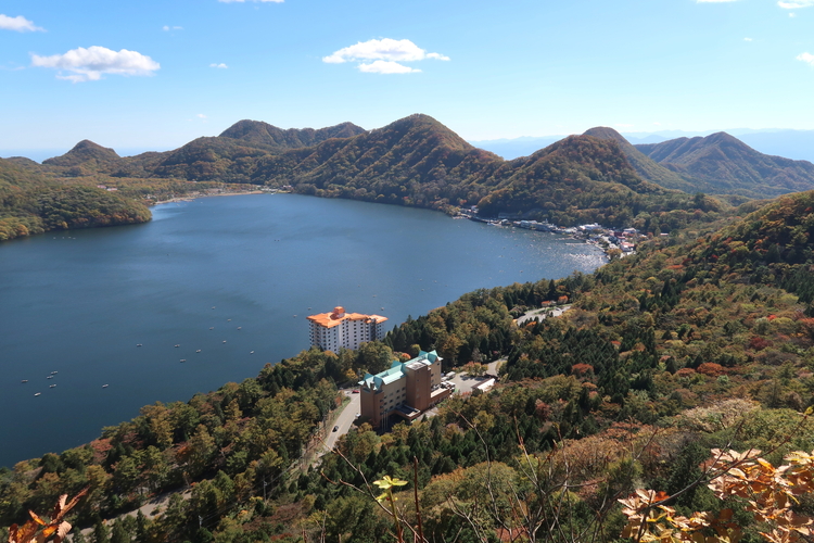 山頂下の展望ポイントから眺めた榛名湖周辺。