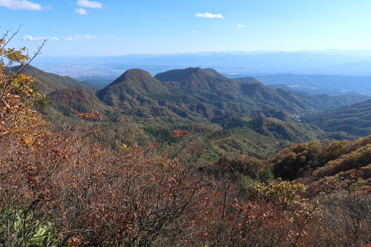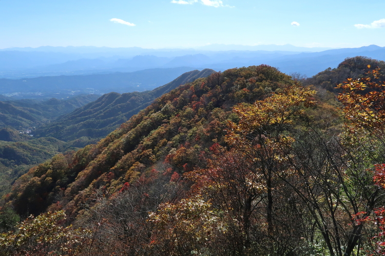 南方向には三ツ峰山と天目山が並び、その奥には奥多摩・奥秩父の山々がずらりと並ぶ。