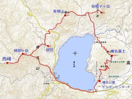 榛名公園ビジターセンターP 6:40 ⇒ 7:25 榛名富士 7:45 ⇒ 8:20 烏帽子ヶ岳登山口 8:25 ⇒ 烏帽子ヶ岳 9:10 ⇒ 鬢櫛山 10:00 ⇒ 車道 10:30 ⇒ (道迷い20分) ⇒ 11:10 硯岩 11:45 ⇒ 掃部ヶ岳 12:25 ⇒ 12:55 西峰 13:15 ⇒ 13:40 掃部ヶ岳 13:50 ⇒ 14:25 湖畔の宿記念公園 14:30 ⇒ 榛名公園ビジターセンターP 15:05