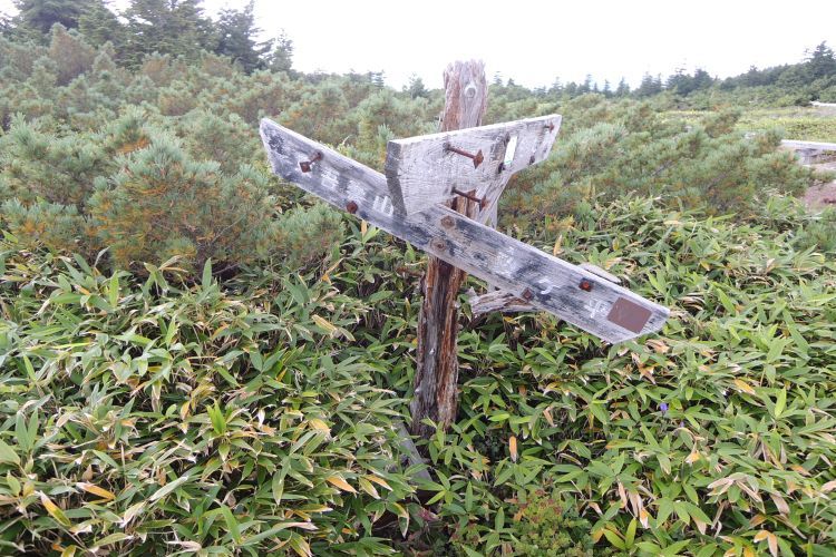 12:55 姥ヶ原の十字路に到着。朽ちた道標を確認して東吾妻山方面へ。