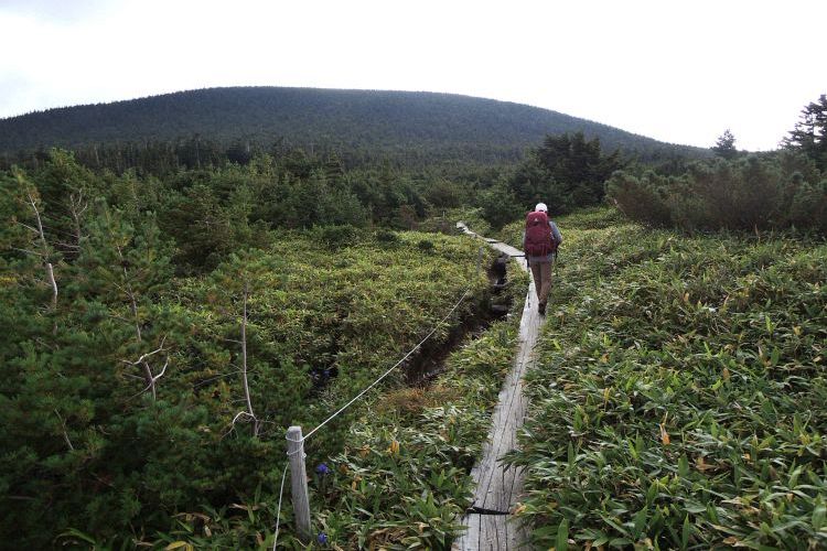 北側前方には前大巓、1928m峰、一切経山が並び、気持ちのよい木道歩きが続く。