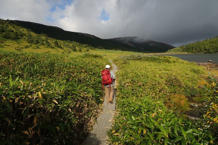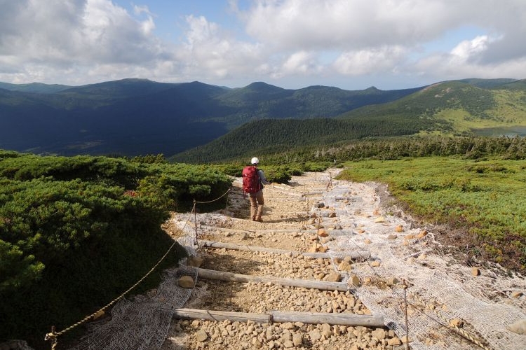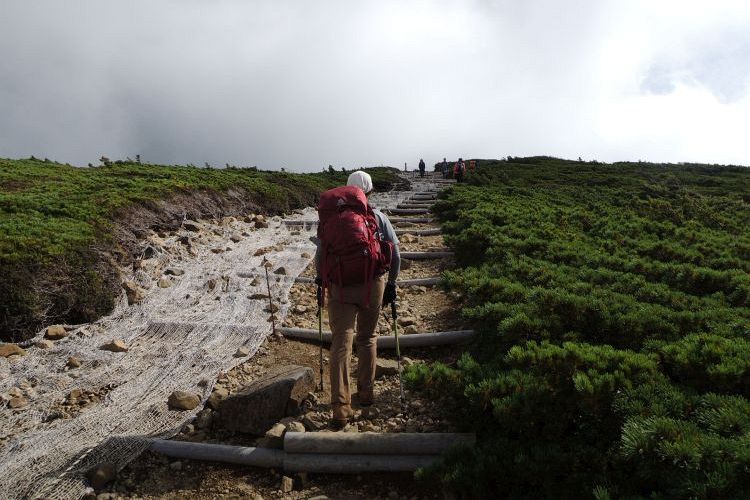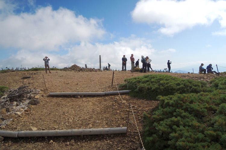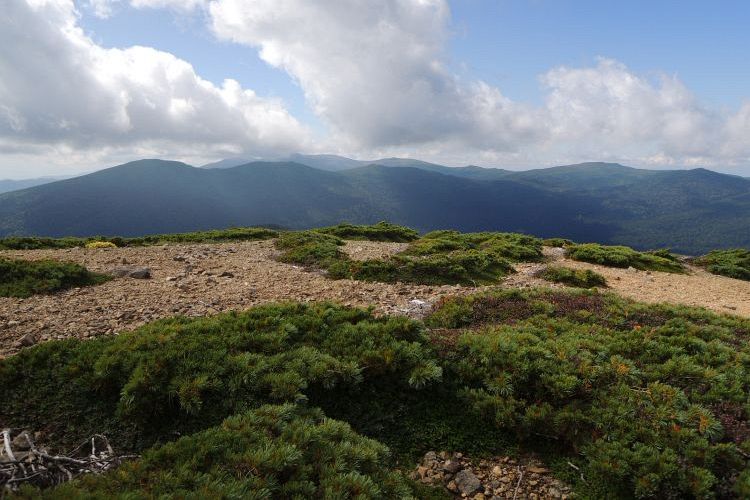 ゆるやかな樹林帯を30分近く上ると、森林限界を超えてハイマツ帯となり、突然視界が開けた。