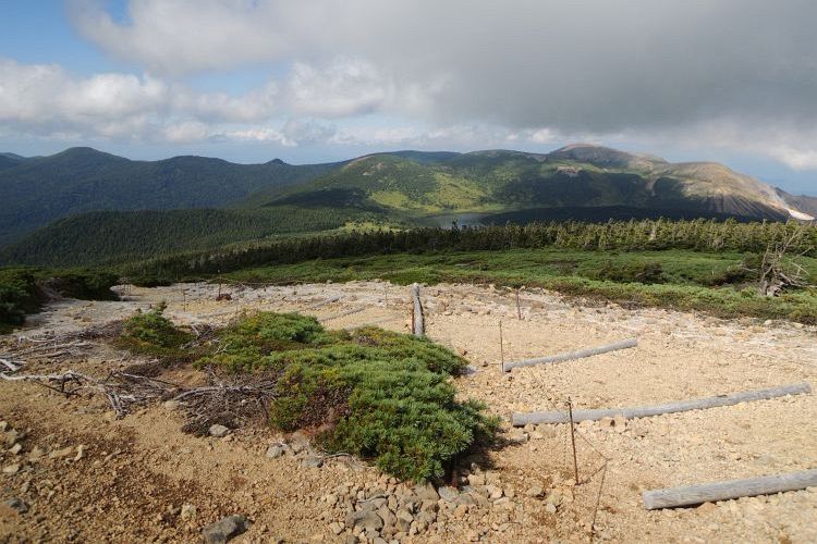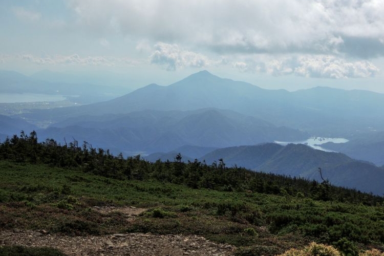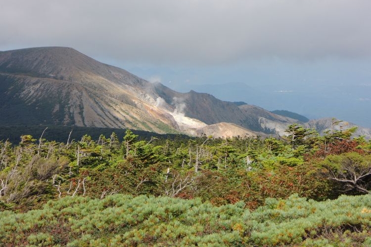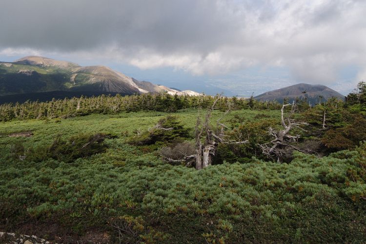 北東方向の一切経山と吾妻小富士。針葉樹林帯とハイマツ帯が綺麗に別れていて、森林限界が視覚的にはっきり分かる。福島県の森林限界は1,600mから2,000mで、東吾妻山は1,900m付近らしい。