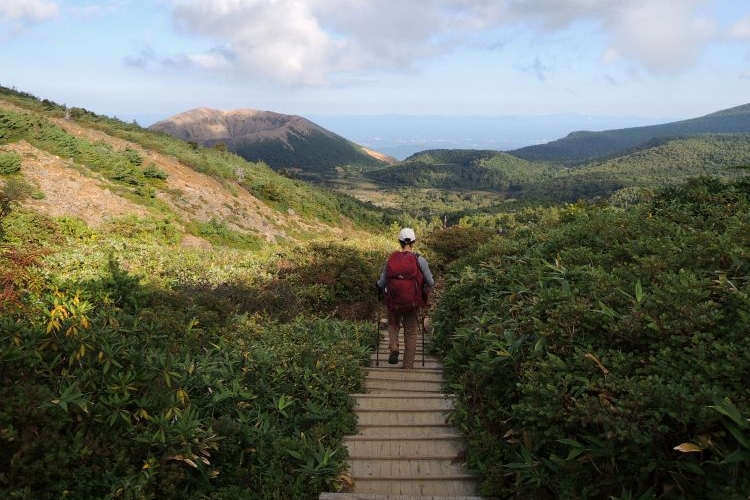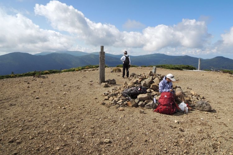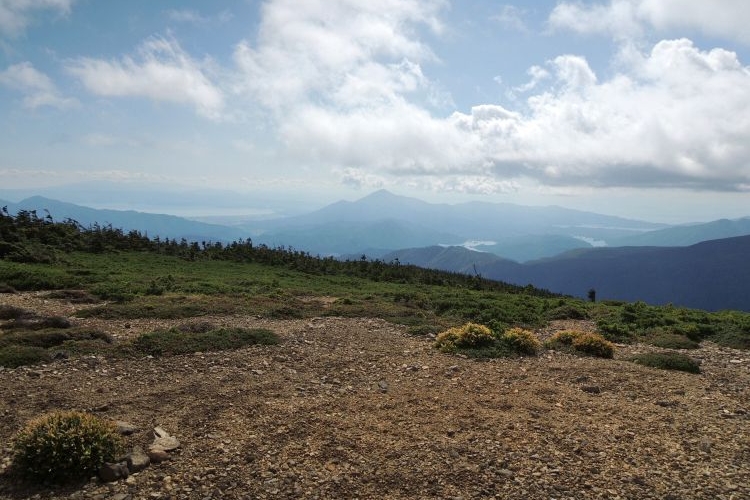 10時40分、磐梯山を下山して八方台から移動開始。道を間違えて磐梯山の南側を回ってしまったが、12時頃浄土平に到着した。吾妻山の山域は、山形と福島の県境に沿って東部、中部、西部に分けられる。磐梯吾妻スカイラインが走る東部には、広大な駐車場を有する浄土平を拠点として、様々な散策コースが用意されている。臨時駐車場から姥ヶ原へ向かったが、出発直後は下山してくる多くの登山者とすれ違った。丘陵のような東吾妻山の山頂は、遮るものがなく広々としており、一切経山から西大巓(にしだいてん)まで続く吾妻連峰の主脈や磐梯山と裏磐梯の湖畔群などを見渡すことができた。鎌沼周辺の景観も素晴らしく、歩きやすい木道が続くので疲れを感じなかった。温泉に行く時間を考えて、一切経山には登らず、吾妻小富士の火口をのぞいて遠征初日を終了。登山日和に恵まれて、無事に同日2座登頂を果たすことができた。