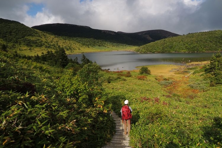 陽光に輝くもくもくとした積雲と、それを鏡面のように映し出す鎌沼。よいところだなぁと深く感じ入った。