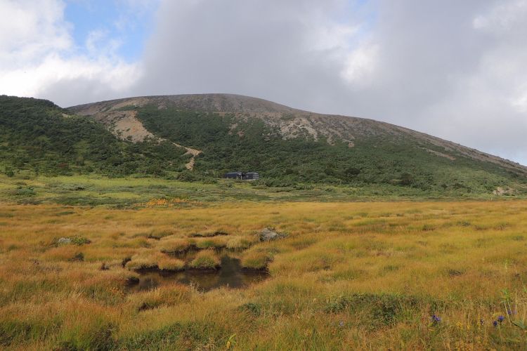 一切経山と池塘と草紅葉。一切経山の麓には酸ヶ平避難小屋が見える。