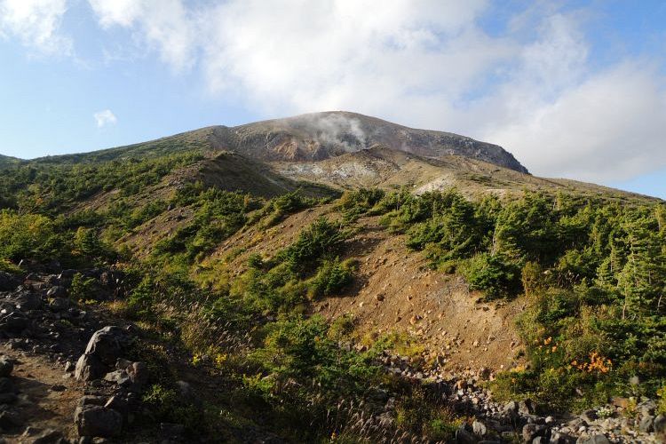 すり鉢状の火口を持つ吾妻小富士(1,707m)。麓の福島市側から見ると小さな富士山のように見えることが名前の由来。