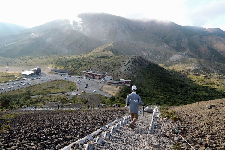 火口の向こう側に見える一番高いところが山頂で標高1,707m。火口の直径は約450mで、火口底までの高低差は約70m。火口壁をぐるっと1周(約1.5km)するには約1時間かかる。
