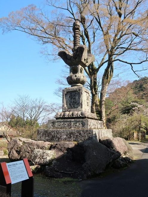 高さ8mの宝篋印塔(ほうきょういんとう)。1817年(文化14年)に、肥後(熊本)の高僧で全国に2千有余もの仏塔をつくった豪潮律師(ごうちょうりっし)が建てたもの。