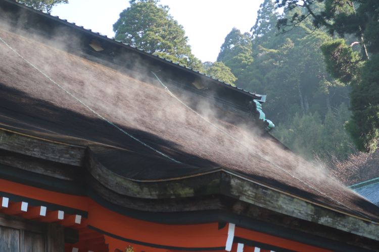 9:10 英彦山神宮に到着。まっさきに奉幣殿の杮葺きの屋根から立ち上がる湯気に目が行った。湯気が見えたのはしばらくの間だが、屋根が生きて呼吸をしているように思えた。