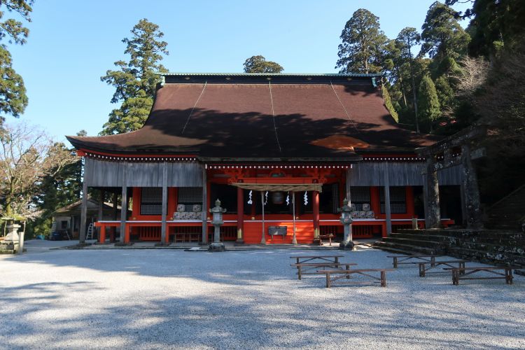 英彦山神宮の奉幣殿。屋根は入母屋造の柿葺で、桃山時代の様式が残っている。英彦山修験道の中心的建造物だったかつての霊仙寺大講堂で、1616年(元和2年)に小倉藩主細川忠興によって再建された。