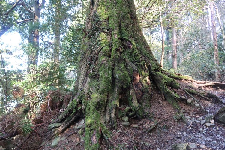 石段脇のの苔むした巨樹。