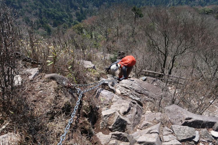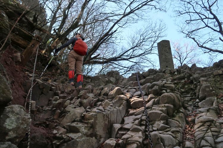 いきなり梯子や鎖場が出てきて、修験道の山らしい道となった。