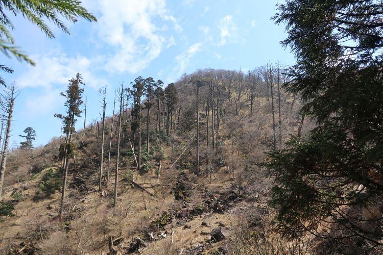 中岳の山頂部が見えてきたが、疎林となった山肌が気になった。