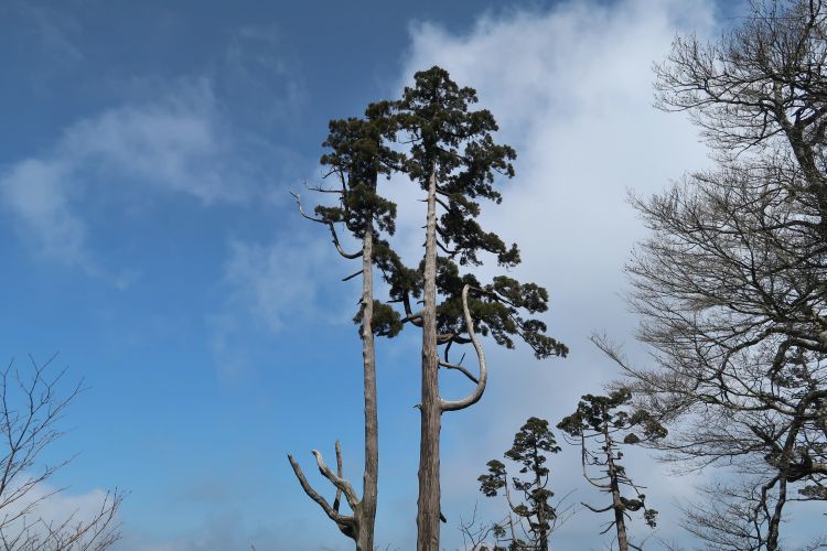 立ち枯れの中に、天高く伸びるスギの巨樹が点在していた。