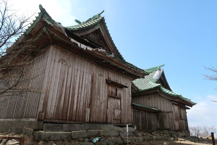 11:00 中岳山頂(1,188m)の英彦山神宮上津宮(上宮)本殿に到着。主祭神は農業や勝運の神様として知られる天忍穂耳命(あめのおしほみみのみこと)、配神として伊耶那岐命(いざなぎのみこと)と伊耶那美命(いざなみのみこと)が祀られている。