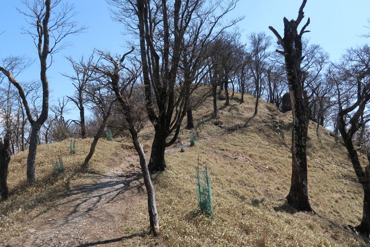 山頂下の山肌は倒木や立枯れで荒涼としており、正直荒れ放題という印象を受けた。食害防止用(?)のネットが張られて養生しているようにも見えたが、残念な状況に思えた。