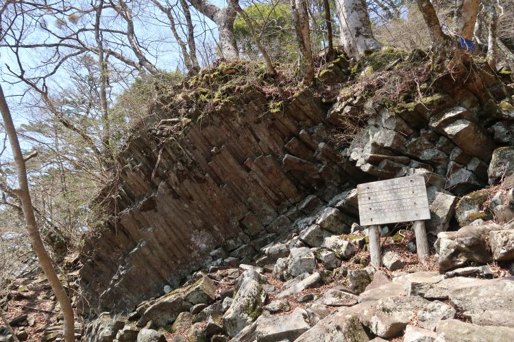 12:45 材木石を通過。噴出したマグマが急速に冷えて固まった安山岩の柱状節理で、英彦山の鬼杉伝説によると、鬼が社を建てようと伐り出した材木の残りが岩になったと云う。
