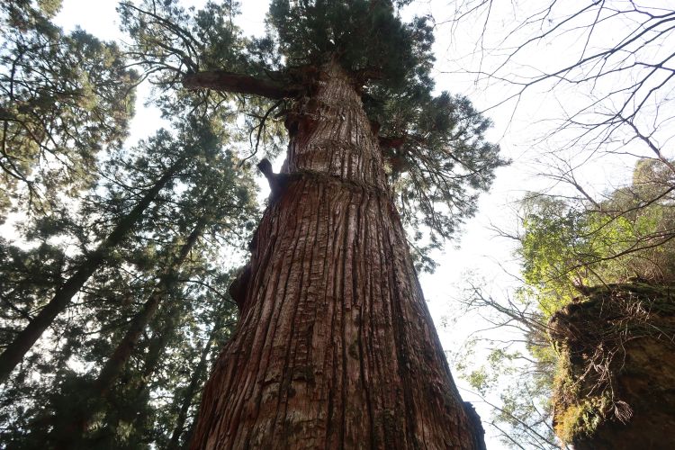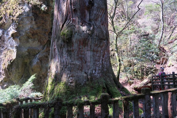 説明板によると、奈良時代から生育しており、周囲12.4m、高さは38mある。以前は60m以上あったが、上半分が倒れてしまったらしい。国の天然記念物に指定されている。鬼杉の巨大さが写真ではまったく伝わらないのがもどかしい。