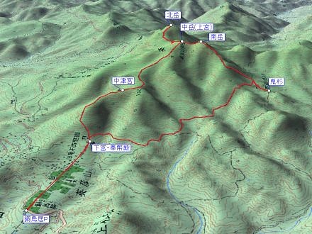 銅鳥居P 8:35 ⇒ 9:10 英彦山神宮(奉幣殿) 9:20 ⇒ 10:05 中津宮 10:10 ⇒ 11:00 中岳(上津宮)11:25 ⇒ 北岳 11:35 ⇒ 11:50 中岳 11:55 ⇒ 南岳 12:05 ⇒ 13:05 鬼杉 13:20 ⇒ 英彦山神宮(奉幣殿) 14:25 ⇒ 銅鳥居P 14:45